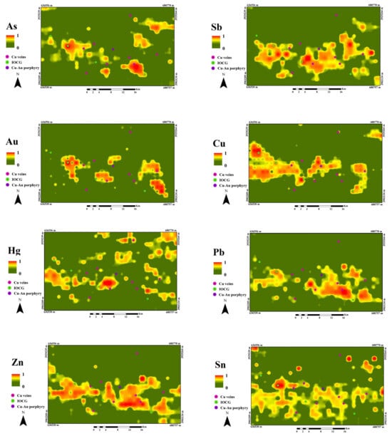 Various techniques and concepts have been developed to determine geochemical anomalies and create layers of evidence for MPM on a regional scale [40,61,62]. These methods primarily focus on investigating the behavior and geochemical information of elements that show a positive association with mineralization [40,47]. In other words, the evidence layers are created according to the conceptual model of the mineralization being sought. During MPM with anomaly detection algorithms, it is important to use evidence layers that are suitable and have a high correlation with the targeted mineralization [12]. In other words, when using unsupervised anomaly detection methods, the layers will be better created based on the conceptual model of the target mineralization. Therefore, the information on eight geochemical elements was used in this study, according to the conceptual model (see Section 3) of the sought mineralization, and the values of these layers were transformed into 0 and 1 spaces using the logistic function. Figure 8 shows the resulting layers.