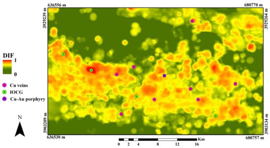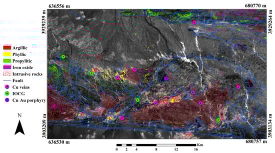 - In general, hydrothermal and iron oxide alteration have been shown to be the main features of hydrothermal deposits, such as porphyry copper mineralization [38]. Alteration halos, such as potassic, phyllic, argillic, and propylitic zones, as well as iron oxide alteration, are typically found in the vicinity of hydrothermal copper deposits and have a considerable spatial extent. Therefore, ASTER remote sensing image processing was used in this study to identify areas that exhibit these alterations.