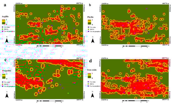 The evidence layers related to the proximity maps of (a) the argillic alteration zone; (b) the phyllic alteration zone; (c) the propylitic alteration zone; and (d) the iron oxide alteration zone.