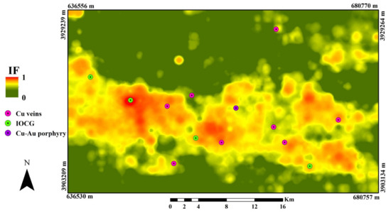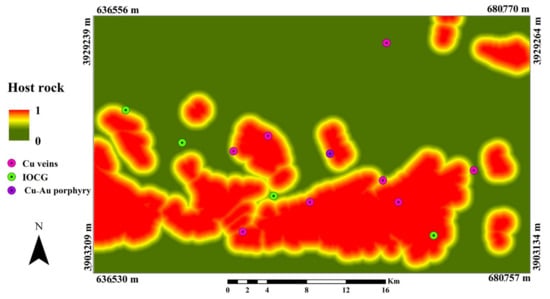 Hydrothermal copper deposits, such as Cu–Au porphyry deposits and Cu veins, as well as other hydrothermal systems, often occur in close association with intrusive rocks, such as granite, granodiorite, and diorite from the Eocene–Oligocene period in the study area [34,35,36]. These intrusive rocks have played a critical role in the formation of mineral deposits in the Feizabad region, so proximity to these rocks significantly increases the likelihood of discovering hydrothermal copper deposits [34]. Consequently, exploration efforts in areas close to these intrusive rocks are more promising than in areas further away. To develop a relevant evidence layer associated with intrusive rocks, the intrusive units were first digitized using ArcMap 10.8. A layer was then created for the proximity to the intrusive rocks. Subsequently, the values of this layer were transformed into a fuzzy space using a logistic function to improve the precision and interpretability and reduce the uncertainty in the MPM analysis. Figure 11 illustrates the constructed evidence layer and shows a strong spatial correlation between the known mineral occurrences and these layers. Therefore, this map can be used as a reliable and fundamental layer in mapping the mineral prospectivity of hydrothermal copper deposits.