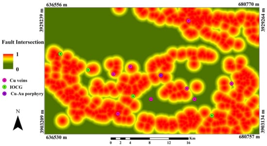 - The formation of hydrothermal deposits, such as Cu–Au mineralization, is associated with the movement of metal-rich fluids through fractures and faults [37]. These geological factors, especially their intersections, act as conduits for fluid movement. In the studied area, faults have played a crucial role in mineralization. Therefore, the proximity to fault intersections can be considered as a key factor and important layer in the MPM analysis;