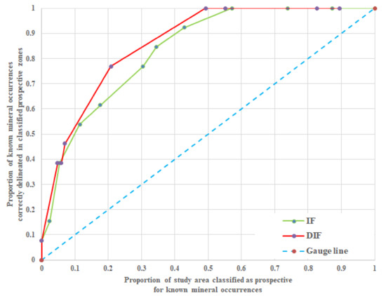 A success rate curve was applied to evaluate and validate the prospectivity models created using the IForest and DIF methods. This curve is one of the most powerful and widely recognized tools for evaluating the predictive capabilities of a model and provides a measure of its accuracy. The assessment analyzes the spatial correlation between known mineral occurrences and the classifications produced by each model [12,71]. Success rate curves are particularly effective in comparing the performance of different prospectivity models for mineral occurrences. From an MPM perspective, appropriate prospectivity models should predict a larger number of known mineral occurrences over a smaller area. Accordingly, the assessment method must facilitate the correlation between different map classes and known mineral occurrences. To achieve this, the map was first classified and then a success rate curve was created to evaluate the accuracy of the classification. This curve shows the spatial correspondence between the favorable area and the location of known mineral occurrences. To plot the success rate curve, different threshold values are determined from the MPM values in the predictive model. Then the proportion of predicted mineral occurrences is compared with the proportion in the favorable area [2].