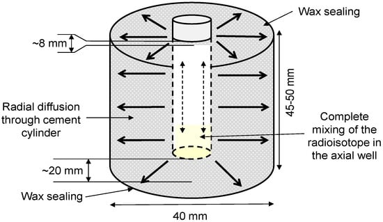 For preparation of the HCP monoliths for the through-diffusion experiments, each of the cement blends was mixed with the respective pre-equilibrated solution at a w/c ratio of 0.45 or 0.55 (NRVB). The fresh pastes were poured into cylindrical polypropylene containers (volume 50 mL) and left to set for 24 h. After removing the cylinders (diameter: 40 mm; length of 40 to 45 mm) from the moulds, the samples were cured in sealed containers for 28 days. After the curing period, a well (diameter: 10 mm; depth: 30 mm) was drilled centrally along the longitudinal axis of the cylinders; the top and bottom surfaces of the cylinders were sealed with wax (Figure 1).