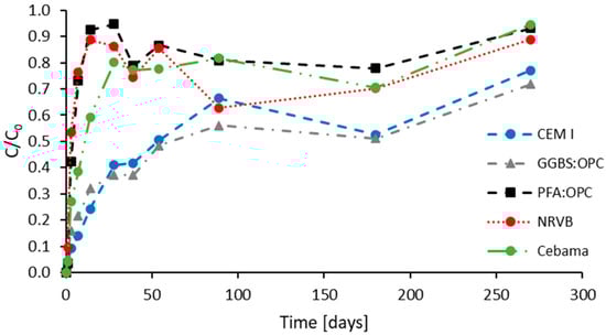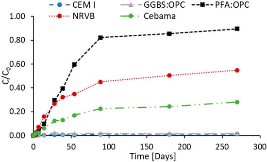 For the assessment of physical factors affecting the diffusive transport of solutes in porous media and to compare the transport properties of the different HCP, through-diffusion experiments with HTO, assumed as an “ideal” conservative tracer, were performed for 270 days. As expected, the initial tritium breakthrough occurred rapidly as 3H was already detected in the samples taken from the solution surrounding the HCP blocks after 24 h (Figure 2). The PFA–OPC and the NRVB blends show the fastest tritium migration, with the 3H concentration approaching the input level after 14 days (i.e., C/C0 → 1). The Cebama reference blend revealed a slightly slower transport rate, reaching a C/C0 value of 0.8 after 28 days; in the experiments with CEM I and GGBS–OPC, the 3H concentrations continued to increase until the experiments’ conclusion at 270 days. Assuming that radionuclide migration was not affected by chemical interactions within the HCP, the rate of transport would be expected to decrease in the order PFA–OPC ≈ NRVB > Cebama >> CEM I ≈ GGBS–OPC.