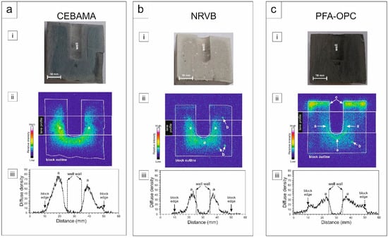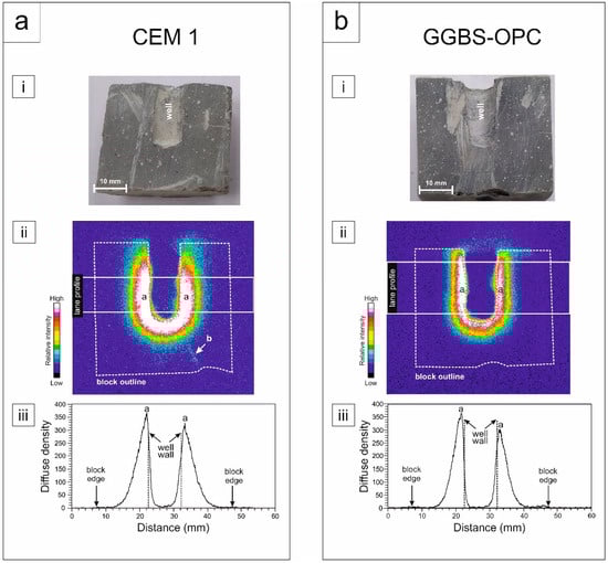 Autoradiography analyses of Cebama HCP block (Figure 5a) and the NRVB HCP block (Figure 5b) show broadly similar patterns for the 36Cl activity distribution. The 36Cl was observed to have diffused throughout both HCP blocks. However, the Cebama block revealed stronger retention of 36Cl, with overall higher activity compared to the NRVB HCP, although this retention is significantly lower than in either the CEM I or GGBS–OPC HPC (cf. Figure 4). For the Cebama block, the 36Cl activity reaches a peak at a depth of between 4 and 6 mm from the well wall (feature labelled “a” in Figure 5a) and progressively decreases over a broad interval towards background activity levels at the very edge of the block. The autoradiography also revealed a slight increase in radioactivity at the outer edge on one side of the block (Figure 5a(iii)), which may indicate that there has been some local back-reaction or resorption of 36Cl from the surrounding fluid during the experiment. The NRVB cement displayed a broad peak in 36Cl activity, approximately half the intensity of that in the Cebama HCP but at a shallower depth of 2–3 mm from the wall of the central well (feature labelled “a” in Figure 5b). The 36Cl activity falls to a relatively low level at about 8 mm from the well wall (within the middle of the HCP block itself), within a much smaller interval than was observed in the Cebama block. A slight increase in 36Cl activity (above background) is just discernible towards the edge of the NRVB block (Figure 5b(iii)), which might indicate some local back-reaction or resorption of 36Cl from the surrounding fluid during the experiment (as was also noted for the Cebama HCP). Again, these autoradiography results are consistent with the through-diffusion data, which showed significant out-diffusion of 36Cl from both the Cebama and NRVB HCP, with the NRVB cement showing the greater diffusive flux of 36Cl (cf. Figure 3).