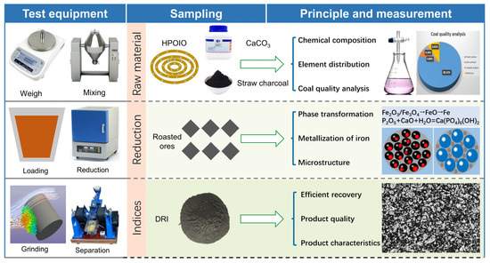 The impact of direct reduction roasting was assessed through parameters such as the iron grade, iron recovery, phosphorus content, and dephosphorization of DRI. The experiment principle and measurement are shown in Figure 2. Additionally, the reduction degree of iron minerals to metallic iron was gauged through iron metallization. These metrics were calculated as follows: