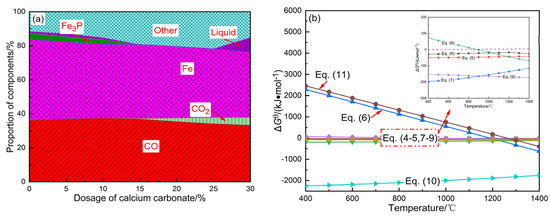 Figure 3b reveals that the Gibbs free energies (ΔGθ) of reactions (4) and (5) are both negative, indicating that ferrous oxide readily reacts with silica and alumina to form fayalite and hercynite compounds that are resistant to reduction, resulting in an insufficient reduction of iron minerals. Similarly, at a temperature of 1200 °C, reactions (6) and (7) exhibit negative ΔGθ values, indicating that under a reducing atmosphere, apatite and phosphorus pentoxide readily react with metallic iron to produce iron phosphide, impeding dephosphorization. Additionally, the negative ΔGθ values of reactions (8) to (10) and the positive ΔGθ value of (11) at 1200 °C indicate that the calcium oxide derived from calcium carbonate decomposition not only reacts with phosphorus pentoxide to generate apatite but also interacts with silica and alumina to form gehlenite, thereby restraining the formation of refractory iron minerals and impeding apatite reduction.