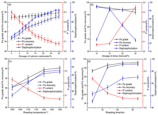 Effects of different roasting conditions on DRI: (a) effect of calcium carbonate dosage; (b) effect of straw charcoal dosage; (c) effect of roasting temperature; (d) effect of roasting time.