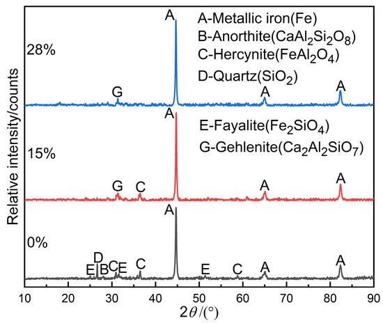 Iron recovery and dephosphorization in relation to the dosage of calcium carbonate exhibit a significant correlation, with a pivotal point identified at 15% calcium carbonate addition. To elucidate the impact of calcium carbonate on the mineral transformation of the calcined ore, XRD analysis was conducted on calcined ore samples with varying calcium carbonate dosages, none, 15%, and 28%, as depicted in Figure 5.