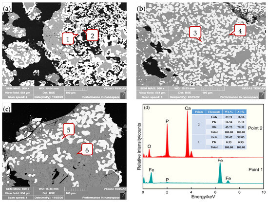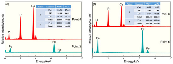 SEM-EDS of roasted ores at different amounts of calcium carbonate: SEM images: (a) 0%; (b) 15%; (c) 28%. Energy spectrum results: points 1, 3, and 5—metallic iron; points 2, 4, and 6—apatite. The EDS spectra in subfigures (d–f) correspond to the marked points in subfigures (a–c).