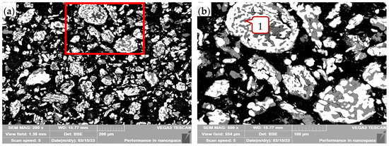 The iron grade, metallic iron content, and phosphorus content in the various products were assessed using methodologies specified in GB/T 6730.65-2009, GB/T 38812.2-2020, and GB/T 6730.18-2006. Additionally, chemical titration was utilized to investigate the distribution of phosphorus across different phases [14]. X-ray diffractometry (XRD, Rigaku D/Max 2500, Rigaku, Tokyo, Japan) was employed to examine the mineral makeup of roasted ores produced under varying amounts of calcium carbonate. SEM–EDS (Vega 3 XHU, Tescan Co., Ltd., Brno, Czech Republic) was utilized to explore the embedding relation between metallic iron particles and gangue, the form of phosphorus occurrence, and the dissociation effect of metallic iron in roasted ores under different calcium carbonate levels. These analyses collectively aimed to unveil the dephosphorization process facilitated by calcium carbonate in the direct reduction roasting of HPOIO.