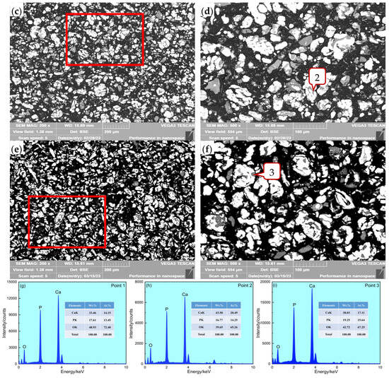 Scanning electron microscopy energy spectrum of magnetic separation concentrate under varying calcium carbonate dosages: (a) 0%; (c) 15%; (e) 28%; (b,d,f) are enlarged images of bounding box areas in (a,c,e), respectively; (g–i) apatite.