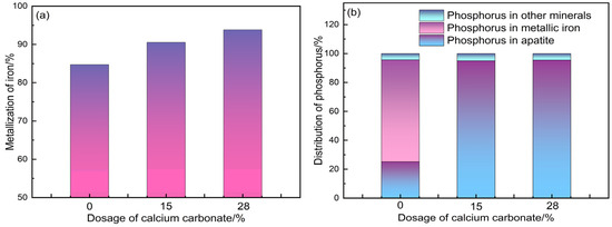 Examination of iron and phosphorus in roasted ore at varying calcium carbonate dosages: (a) iron metallization; (b) phosphorus distribution.