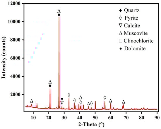 The copper sulfide ore was sourced from Pu’er, Yunnan, China, and was sampled at different supply points by field personnel according to the prevailing production and deposit conditions. Representative ore blocks were subjected to process mineralogy analysis. The remaining ore samples were crushed to below 2.0 mm by a jaw crusher and cone crusher, mixed and prepared for sample preparation, and used for ore sample detection analysis and mineral processing. The crushed ore was ground to an appropriate particle size by a rod mill, and then uniformly sampled for multi-element chemical analysis, phase analysis, and X-ray diffraction (XRD). The XRD results are shown in Figure 1. The gangue minerals in the ore were mainly silicates, carbonates (quartz, calcite, muscovite, dolomite, and clinochlore) and pyrite. The contents of copper sulfide minerals were low, and these are not reflected in the XRD analysis. In the flotation experiments, lime is used as a pH regulator, and combined with hydrogen peroxide and sodium sulfite as inhibitors of pyrite. The collector for copper flotation was a combination of ammonium dibutyl dithiophosphate (ADD), butyl xanthate (BX), and ethyl xanthate (EX) in a ratio of 1:0.5:0.5; terpineol oil was used as a foaming agent. All reagents were chemically pure and purchased from Zhuzhou Flotation Reagent Factory. Before conducting flotation tests, we diluted the reagent in water to a concentration of 0.02%–1%. The types and dosages of reagents ranged in the flotation tests, as shown in Table 1.