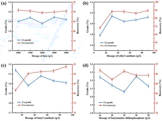 The effect of reagent dosage on the flotation index is shown in Figure 6. A lime dosage test was first carried out under conditions of 70% of the feed passing the 0.074 mm particle size, 50 g/t butyl xanthate, 20 g/t ammonium dibutyl dithiophosphate, and 84 g/t terpenic oil. As shown in Figure 6a, when the lime dosage was insufficient, the copper grade in the rougher concentrate was low. With an increase in lime, the grade first increased and then decreased; copper recovery showed the opposite trend. The optimum grade (2.08%) and recovery (90.42%) of the rougher were achieved at a lime dosage of 1500 g/t (pH = 11.33). The lime dosage was fixed at 1500 g/t for subsequent experiments.