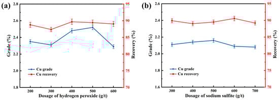 The depression effects of lime in combination with hydrogen peroxide or sodium sulfite on the pyrite flotation were investigated (Figure 7). Tests were carried out using a particle size of 70% passing 0.074 mm, 1500 g/t lime, 10 g/t butyl xanthate, and 84 g/t terpenic oil. As shown in Figure 7a, as the hydrogen peroxide dosage increased, the copper grade in the rougher concentrate first increased and then decreased; the opposite trend was observed with respect to copper recovery. Optimum grade and recovery were achieved using 400 g/t hydrogen peroxide—2.48% and 89.68%, respectively. As shown in Figure 7b, as the sodium sulfite dosage increased, the copper grade first increased and then decreased; recoveries were relatively stable. When the dosage of sodium sulfite was 500 g/t, the copper grade and recovery were 2.16% and 89.51%. These results demonstrate that better flotation was achieved using the combination of lime and hydrogen peroxide for the depression of pyrite. This method was therefore selected for subsequent experiments, at the optimal hydrogen peroxide dosage of 400 g/t.