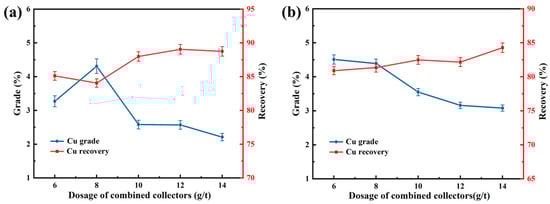 Effects of type and dosage of combined collectors on the flotation index. Butyl xanthate + ammonium dibutyl dithiophosphate + ethyl xanthate at ratios of (a) 1:0.5:0.5 and (b) 0.5:1:0.5.