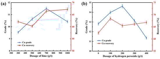 To determine the effect of depressant dosage during cleaning on the flotation index, the lime and hydrogen peroxide additions were investigated. As shown in Figure 9a, when the dosage of hydrogen peroxide was fixed at 200 g/t, the copper grade in the cleaner concentrate first increased and then decreased as the lime dosage increased; recovery showed the opposite trend. Both the copper grade and recovery of the cleaner concentrate were relatively high when the lime dosage was 700 g/t, so this was selected as the optimal value. Figure 9b shows that when the lime dosage was fixed at 700 g/t, the copper grade in the cleaner concentrate first increased and then decreased as the hydrogen peroxide dosage increased; recovery first increased, then decreased, and then increased. The relatively ideal copper grade of the cleaner concentrate was achieved at 200 g/t hydrogen peroxide. This was selected as the optimum value, owing to the copper grade being assigned higher priority than the recovery.