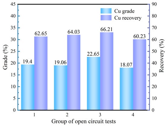 To determine the optimal reagent system for an open-circuit test, flotation tests were carried out for different reagent systems (Figure S1–S4). For the rougher stage, the dosages of lime and hydrogen peroxide were fixed at 1500 g/t and 400 g/t, respectively; those of the combined collectors and terpineol oil were fixed at 10 g/t and 84 g/t, respectively. The first cleaner stage used 700 g/t lime and 200 g/t hydrogen peroxide. The results of the four open circuit processes are shown in Figure 10. Compared to the second cleaner stage without lime (Figure S1), the flotation effect of the second cleaner stage with 300 g/t lime was better. During scavenging, adding 4 g/t of combined collector for the first scavenger (Figure S2) and 2 g/t of combined collector for the second scavenger produced better flotation results than not adding the combined collector. However, the flotation effect was poor when adding 4 g/t of the combined collectors in the first cleaner stage (Figure S4). Therefore, the optimal flotation index was obtained by open-circuit process 3 (Figure S3), with a copper grade of 22.65% and recovery of 66.21%.
