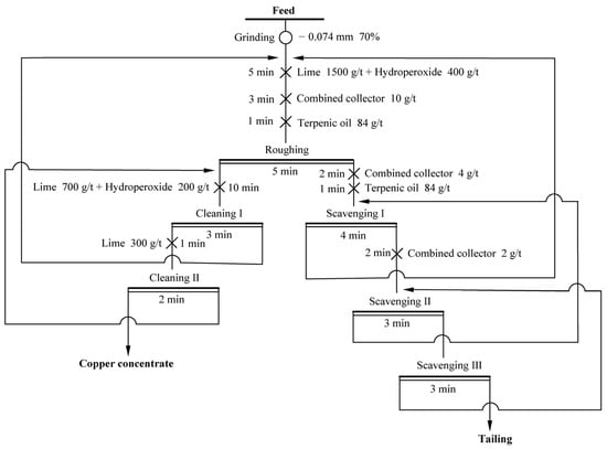 The appropriate fineness of the grind is a prerequisite for ensuring the effective recovery of valuable minerals in a flotation process. The valuable minerals should be liberated to single phases and have an appropriate particle size. If the ore particles are too coarse, they will not float, even if the mineral particles are liberated, because their weight will exceed the floating capacity of the bubbles [33]. The effect of grinding fineness on the flotation index of copper sulfide ore is shown in Figure 5. The tests were carried out by choosing the −0.074 mm particle size content to account for 65%, 70%, 75%, 80%, and 85% of the ore mass. The flow chart is shown in Figure 5a. Lime (1000 g/t) was used as a pH regulator and depressant to adjust the pH value of the pulp and depress pyrite flotation, while butyl xanthate (50 g/t) and ammonium dibutyl dithiophosphate (20 g/t) were used as collectors for the copper sulfide minerals, and terpenic oil (84 g/t) was used as a frother. The results are shown in Figure 5b. As the −0.074 mm particle size content increased from 65% to 85%, the grade of the copper concentrate trended downward; copper recovery showed a trend of rising, falling, and then rising again, but the overall change was not significant. When the −0.074 mm particle size content was 70%, the grade and recovery of the copper concentrate were relatively ideal; for finer particles, the copper grade would be significantly reduced and the grinding cost would increase. Therefore, the optimal grinding fineness was selected to be −0.074 mm particle size content, accounting for 70% of the flotation feed.