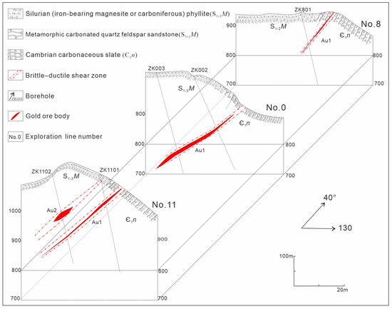 The Xinjiazui gold deposit is located in the northeast of the Dingjialin gold deposit (Figure 2a). The gold ore bodies mainly occur in the fault contacts within the Silurian Maoxian Group (S1–2M) and the Cambrian Niutitang Formation (Є1n), and they are controlled by the Yanzibian–Huashigou brittle-ductile shear zone, consistent with soil geochemical anomaly (Figure 2b). The largest gold ore body, Au1, is mainly controlled by three exploration lines (Nos. 8, 0, and 11; Figure 3). Among them, the No. 0 exploration line, particularly at borehole ZK003, shows the best ore performance (Figure 3), and is generally characterized by significant arsenopyrite mineralization (Figure 4). Au2 is a blind lenticular orebody only exposed in ZK1102 within S1–2M (Figure 3), with a true thickness of 5.67 m and an average gold grade of 2.57 g/t. Au3 is only exposed at the surface and does not extend very deep, and is closely associated with quartz diorite dikes in space (Figure 2b).