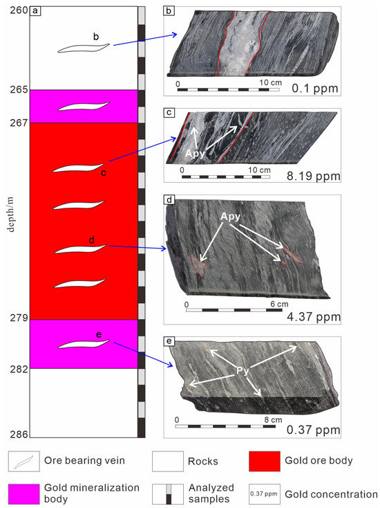 (a) Diagram of ZK003 (260–286 m) in the Xinjiazui gold deposit; (b–e) Different mineralization intensities at different locations correspond to different gold grades (hand specimen photograph).
