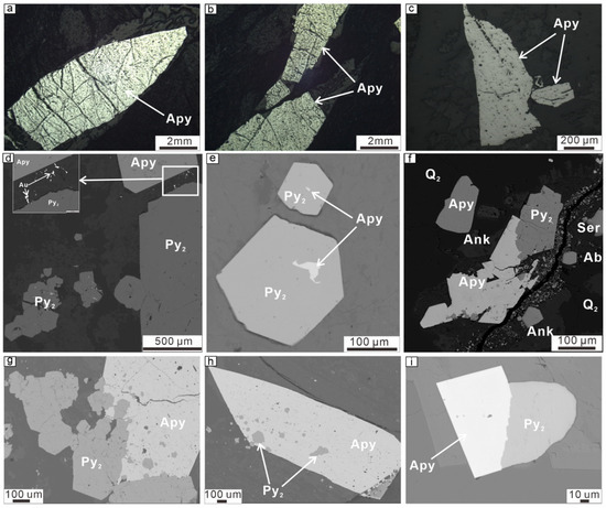 Photographs showing the characteristics of arsenopyrite in stage II. (a–c): Reflected light images; (d–i): Backscattered electron images. Mineral abbreviation: Ab: albite; Ank: ankerite; Au: native gold; Apy: arsenopyrite; Ser: sericite; Py: pyrite; Q: quartz.