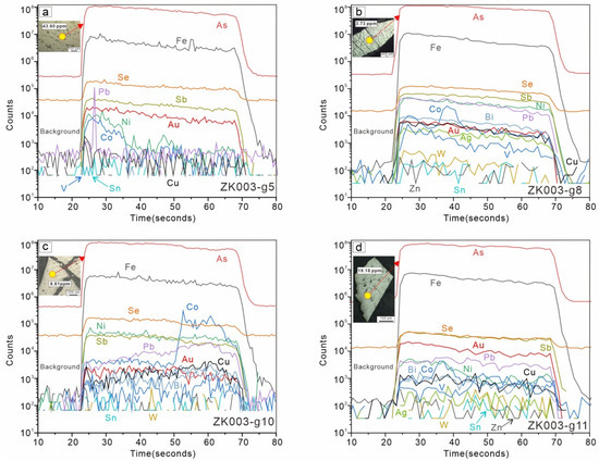(a–d) Representative LA–ICP–MS time-resolved laser ablation depth profiles of arsenopyrite of different samples from ZK003. The illustration shows the LA–ICP–MS analysis position of minerals under reflected light.
