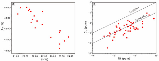 Diagram of major and trace elements of arsenopyrite in the Xinjiazui gold deposit. (a) As vs S two-dimensional diagram, (b) Co vs Ni two-dimensional diagram.