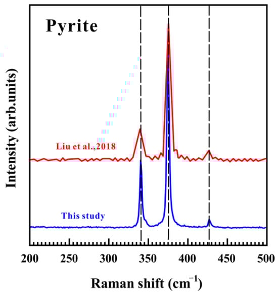 Meanwhile, the Raman spectra of natural pyrite were collected by a Renishaw 2000 Raman Spectrometer (TCS SP8, Leica, Gloucestershire, UK) at the Key Laboratory of High-Temperature and High-Pressure Study of the Earth’s Interior, IG, CAS, China. For the detailed measurement method, please refer to Hong et al. [15]. As displayed in Figure 2, the experimental results of our pyrite samples are in agreement with the three characteristic peaks of the Eg, Ag, and Tg(3) modes of natural pyrite from Liu et al. [16].