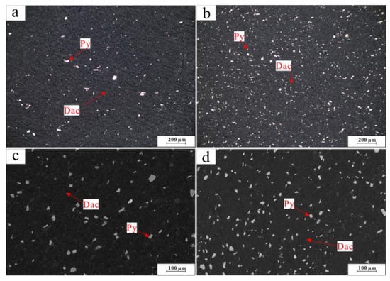 In order to identify the distribution of the minerals in the hot-pressed dacite samples, representative optical and electronic back-scattered diffraction (EBSD) images were taken by using an optical microscope and a scanning electron microscope, as illustrated in Figure 3. The dark areas in the image are the minerals of dacite, and the particles with high brightness are composed of pyrite. From the optical and EBSD results in Figure 3, the dacitic rocks with fine-grained (less than 8 μm) and homogenously distributed pyrite contents (5 vol.% and 10 vol.%) were successfully obtained in the hot-pressed sintering experiments at 1.0 GPa. Furthermore, there were no extra mineralogical phases revealed in the observations, indicating that the samples remained in a stable condition during the experiments.