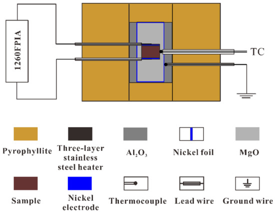 With a Solartron–1260 impedance spectroscopy analyzer, high-pressure complex impedance measurements for this study were systematically performed in a YJ-3000 t high-pressure apparatus. A schematic diagram of the sample assemblage is illustrated in Figure 4.