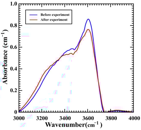 To exactly acquire the variation in water content, we employed Fourier transform infrared (FT-IR) spectroscopy to collect infrared spectra for the original and recovered samples. All of them underwent double polishing, resulting in a thickness of approximately 100 μm. To obtain an evenly distributed water content, a minimum of five spectra were acquired from various regions of the sample, and the results were subsequently averaged. The spectra of the hydroxyl absorption band were systematically obtained within the 3000–4000 cm−1 wavenumber range (Figure 5).