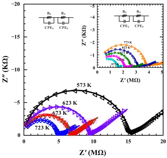 In this study, the electrical conductivities of dacite containing seven pyrite contents (i.e., 0, 3, 5, 7, 10, 20, 100 vol.%) were measured systematically from 573 K to 973 K under 1.0 GPa. Meanwhile, we conducted the measurements of the dacite with 5 vol% pyrite at 1.0–3.0 GPa. Figure 6 illustrates the impedance spectra of dacite incorporating 10 vol.% pyrite under temperatures of 573–973 K and 1.0 GPa. The electrical transport within the grain interior is depicted by a curve in semi-circular shape, while the polarization effect occurring at the interface between the sample and electrode is illustrated by a little tail [19,20]. To acquire the resistance value from the complex impedance spectra, an equivalent electrical circuitry was constructed by connecting RS–CPES and RE–CPEE in series. Here, RS represents the sample resistance, while RE denotes the boundary-surface resistance of the electrode. CPES and CPEE are the components that maintain a constant phase in the sample and electrode–sample interface, respectively.