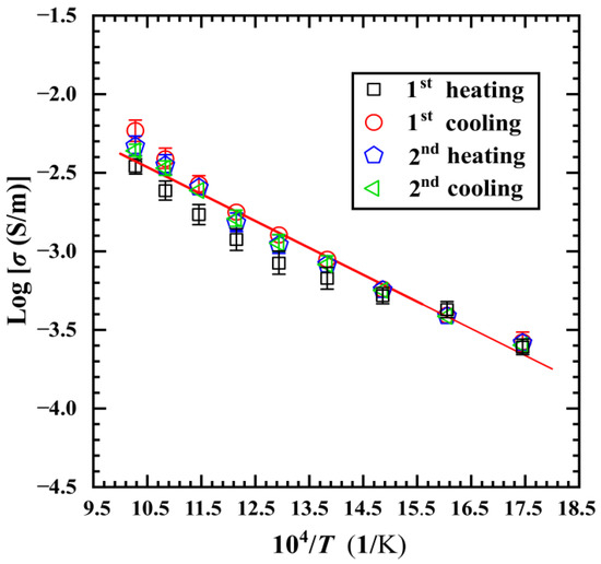 Figure 7 illustrates the Log σ of natural dacite as a function of the inverse temperature. All of the experiments were measured during two consecutive heating and cooling cycles within 573–973 K at a pressure of 1.0 GPa. The electrical conductivity in the first heating cycle was lower than that in the subsequent cooling and second heating–cooling cycles in the range of 673 to 973 K. In the following measurement cycles, the electrical conductivity values demonstrated strong reproducibility. This suggested that the sample chamber had reached a stable state. And thus, the electrical conductivity data were fitted using the complex impedance spectra collected during the initial cooling and the following heating–cooling cycles. All of these electrical parameters fitted for dacite with various pyrite contents are demonstrated in detail in Table 2.