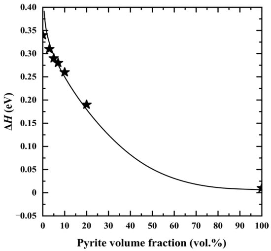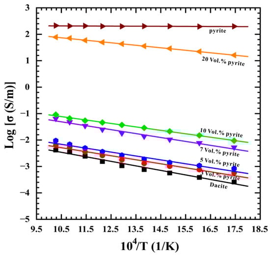 In Figure 10, the correlation between the activation enthalpy and the volume fraction of pyrite is displayed. With increasing pyrite content, it demonstrated a steady increase in the conductivity of the dacite-pyrite system, while ΔH reduced from 0.31 eV to a minimum of 0.01 eV.