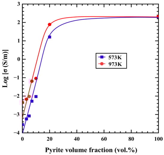 To comprehensively clarify the effect of the specific volume percentage of pyrite on the dacitic electrical conductivity, experimental data under 573 K and 973 K were acquired at a stable pressure condition of 1.0 GPa (Figure 11). Within the range of 0–20 vol.% of pyrite in dacite, the results at 573 K increased from 2.83 × 10−4 S/m to 16.17 S/m, and from 4.56 × 10−3 S/m to 77.73 S/m at 973 K. And, more notably, when the volumetric concentration of pyrite increased to 7 vol.%, the electrical conductivities dramatically enhanced about 10 times compared with those at 5 vol.%. Previous studies confirmed that the electrical conductivity abruptly increased when minerals with exceptional conductivity interconnected [7,8,9,10,11]. For the percolation threshold, it depended on the minimum value of the volume fraction for the interconnected minerals. Therefore, the percolation threshold for pyrite in dacite is ~7 vol.%.