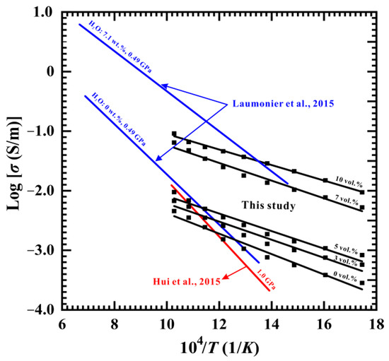 On the basis of our present study, the electrical conductivity of the pyrite-bearing dacite had a positive dependence on the iron content. Under the same condition of temperature and pressure, there was a corresponding rise in the electrical conductivity as the volume fraction of pyrite increased. Moreover, the value of the activation enthalpy was 0.24 ± 0.16 eV, and the value of the activation volume was 4.50 ± 0.87 cm3/mol for our 5 vol.% pyrite-bearing dacite. These were compatible with those (ΔU = 0.76 ± 0.06 eV, ΔV = 4.96 ± 0.52 cm3/mol) of natural quartz andesite from Hui et al. [13]. The slight discrepancy in the activation enthalpy could be attributed to variations in the iron content, melting conditions, and water content of samples.