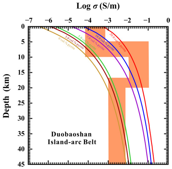As displayed in Figure 13, with the increase in depth from 0 km to 45 km, the electrical conductivity of pyrite-bearing dacite enhanced accordingly. At a certain depth of 5 km, the electrical conductivity of pyrite-bearing dacite improved ~1000 times in magnitude when the pyrite content varied from 0 vol.% to 20 vol.%. The orange belt represented the electrical conductivity profile of the Duobaoshan island arc from Meng et al. [4]. When the depth is less than 20 km, the anomalously high electrical conductivity phenomenon of the Duobaoshan island arc can be in agreement with the electrical conductivities of the dacite with 7–20 vol.% pyrite. And when the depth increased from 20 to 45 km, the characteristics of the electrical structure of the Duobaoshan island arc can be constrained by the electrical conductivities of dacite with 0–5 vol.% pyrite. Previously, the results from geophysical observations indicated that pyrite migrated upward along the edge of a tectonic zone and accumulated significantly at depths of 5–10 km underground [46,47,48]. The volume fraction of enriched pyrite in the Duobaoshan island arc could reach up to 20% [49,50]. Therefore, the electrical conductivity results we acquired can effectively explain the anomalously high electrical conductivity phenomenon in the Duobaoshan island arc. Furthermore, the variation tendency of the electrical structure at different depths in this region can also be reasonability elucidated by the pyrite content in dacite.