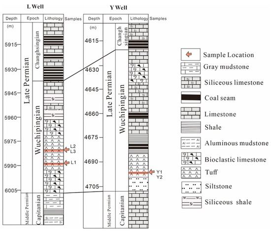 Stratigraphic columns and sample locations of the Wuchiapingian Formation in two drilled wells.