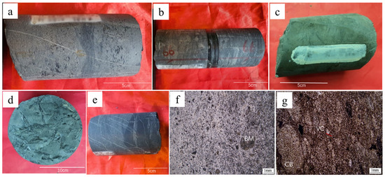 Macro–microscopic characterization of samples from the Kaijiang–Laingping Trough. (a) Tuff and marl unequal thickness interbedding; stratification is evident; L well, 5991.65 m. (b) Tuff and marl interbedded; trapped mud tearing debris; L well, 5989.9 m, L1 sampling depth section. (c) Visible plant fossils; sedimentary tuff; Y well, 4699.3 m, Y1 sampling depth. (d) Visible plant fossils; sedimentary tuff; Y well, 4699.7 m, Y2 sampling depth section. (e) Tuff and marl unequal thickness interbedding; L well, 5990 m. (f) Small amount of bioclastic debris, most abundant in crystalline debris; sedimentary tuff; L well, 5989 m, L1 sample slice observation. (g) Visible clumps of tuff; higher content of rock and glass debrisl Y well, 4699.45 m, Y1 sample slice observation; BM, bioclastic material; CB, crystalline bond; VC, vitroclastic.