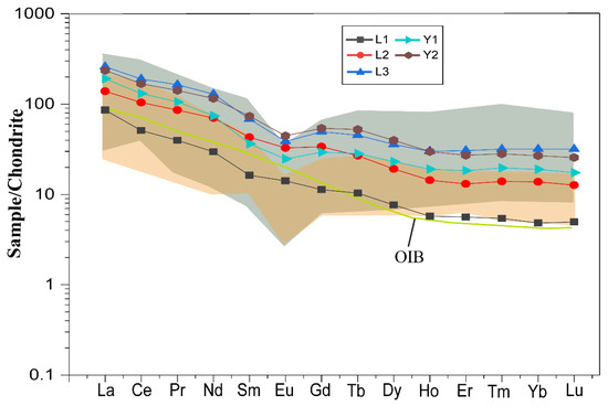 Chondrite-normalized REE pattern distributions from tuff samples of the Wuchiapingian Formation. Normalized values for chondrite are from Sun and McDonough [38]; OIB data are from Rudnick and Gao [39]. The orange area shows the distribution of Late Permian volcanic ash samples in Shangsi, with data from Huang et al. [29]; the dark green area shows the distribution of Late Permian volcanic ash samples from eastern South China, with data from Liao et al. [40].