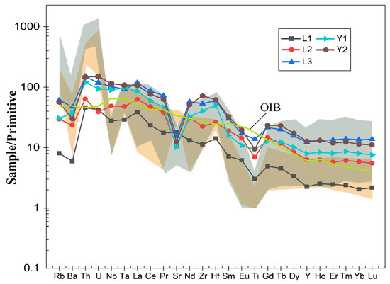 Primitive mantle-normalized spider grams from tuff samples of the Wuchiapingian Formation. Normalized values for primitive mantle are from Sun and McDonough [38]; OIB data are from Rudnick and Gao [39]. The orange area shows the distribution of Late Permian volcanic ash samples in Shangsi, with data from Huang et al. [29]; the dark green area shows the distribution of Late Permian volcanic ash samples from eastern South China, with data from Liao et al. [40].
