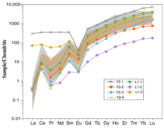 Chondrite-normalized REE patterns of zircons from two wells. Normalized values for primitive mantle are from Sun and McDonough [38]. The gray area shows the distribution of Late Permian volcanic ash samples in Shangsi, with data from the Huang et al. [29]; the orange area shows the distribution of tuff samples from the Wuchiapingian Formation in Mingyuexia, with data from Zhang [41].