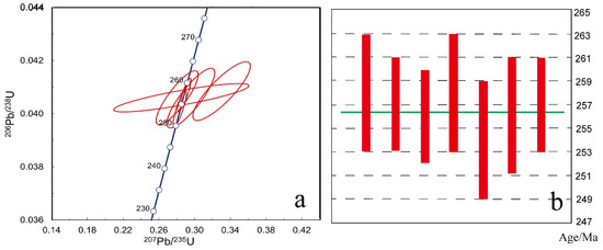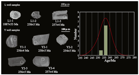 The U-Pb ages of zircons are shown in the figure after excluding two outliers (Figure 8). According to the general principle, for zircon sites > 1000 Ma, the 207Pb/206Pb surface age is chosen to represent the zircon-specific age value, while for zircon sites ≤ 1000 Ma, the 206Pb/238U age is chosen to represent the zircon-specific age value [44]. Among the tested zircon ages of sedimentary tuffs, seven zircon 206Pb/238U ages are relatively concentrated between 255 and 259 Ma, while one zircon 207Pb/206Pb age > 1000 Ma is 1887 ± 53 Ma. From the measured results, the L1-1 zircon is too old and may be associated with ancient basement rocks.