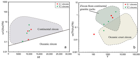 Trace element discrimination figure of zircon for determining the tectonic background of zircon formation. (a) Hf versus U/Yb diagram (after [50]); (b) Y versus Th/Yb diagram (after [53]).