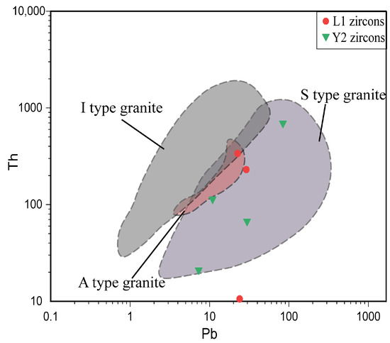 Geochemical analysis of zircon provides crucial insights into the magma source zone and serves as key evidence for identifying the source of tectono-magmatic material [50]. Interaction plots of the zircon trace element U/Yb vs. Hf (Figure 9a) indicate a continental rather than oceanic origin for zircons in sedimentary tuffs. Further analysis of zircon Th/Yb vs. Y (Figure 9b) suggests a derivation of the sedimentary tuff from continental granite. In the Th-Pb rendezvous map of zircon, all tuff data points fall within the area associated with S-type granite, indicating a granite formed by partial melting and crystallization with crustal sediments as the source rock [51] (Figure 10). This pattern is less pronounced in the L1-1 sample, and the low -Th and -U of the sample may be related to its Early Proterozoic age, while it is likely that the zircons in this sample were affected by regional hydrothermal activity during the epochal change between then and now [52].