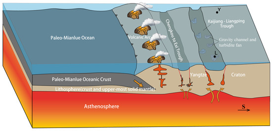 The Kaijiang–Liangping Trough, located in the northern part of the Sichuan Basin within the northern section of the Yangtze Craton, has a northwest–southeast orientation. Surrounding this trough, a series of Permian and Triassic extra-large carbonate oil and gas fields have been discovered, including the Puguang and Yuanba fields, with considerable potential for oil and gas exploration. The formation and evolution of the Kaijiang–Liangping Trough are intricately linked to the carbonate reef reservoirs on both sides. Nevertheless, there has been ongoing debate regarding the timing and mechanism of its formation. Most of the Kaijiang–Liangping Trough is thought to have begun in the Late Middle Permian Changxing Stage [1] and finally at the end of the Triassic Feixianguan Formation sedimentation [2]. The formation of the Kaijiang–Liangping Trough involves the interaction of the North China Craton, the Yangtze Craton, and neighboring plates. It is hypothesized that the trough may have been formed by the tensile action of the Yangtze Plate’s crust during the activity of the Emeishan mantle column (Emeishan Large Igneous Province) [3]. However, there is also controversial speculation that it may be related to the subduction extinction of the limited oceanic South Qinling Mianlue Ocean in the northern part of the Yangtze Plate [4,5]. The Emeishan Large Igneous Province was formed at the transition from the Middle to Late Permian and is widely distributed in southwest China and northern Vietnam. Its lithologies consist mainly of magnesium–iron ejecta and intrusive rocks, with sporadic outcrops of late-stage acidic volcanic rocks [6,7,8]. The Mianlue Ocean was an ancient ocean that existed between the North China Craton and the Yangtze Craton during the Carboniferous–Triassic period. It was once part of the Paleotethys Ocean. The subduction collision of the Late Yangtze Craton with the South Qinling Landmass led to a scissor closure along the Mianlue Suture Zone from east to west [9,10,11,12]. However, the mode of dive collision and the timing of closure have not been well understood.