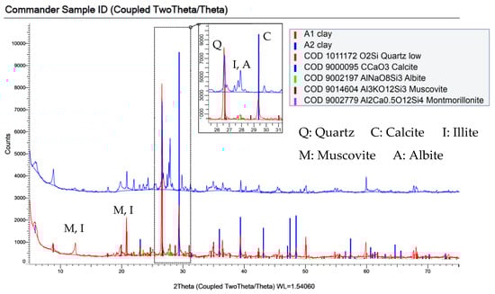 The crystallographic structure of the two clays was determined using Bruker 2D Phaser XRD. Clay A1 consisted of calcite, illite, quartz, and chamosite (chlorite), a mineral with the presence of iron and magnesium, while the analysis of clay A2 showed that it was composed of quartz, illite, albite, montmorillonite, and microcline (feldspar) (Figure 1).