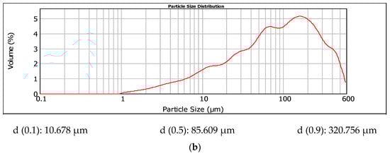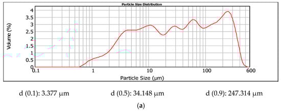 Both clayey soils were sieved through a 500 MIC sieve (0.5 mm), while their particle size distribution after sieving is presented (Malvern 2000, Mastersizer, Malvern Panalytical Inc., Westborough, MA, USA). Correspondingly for sample A1, 90% of the clay particles were below 247,314 μm, while 50% were below 34,148 μm. Thus, the predominant particles had a diameter between 2 and 400 µm, while sample A2 contained coarser particles and a more uniform granulometry, with its particle size ranging from 8 to 500 µm (Figure 2). Moreover, Atterberg limits were estimated (ASTM-D4318-00), while the plasticity index of both soils was calculated. Furthermore, both soils were classified using the plasticity chart by Casagrande (ASTM D2487-17) (Table 2) [,].